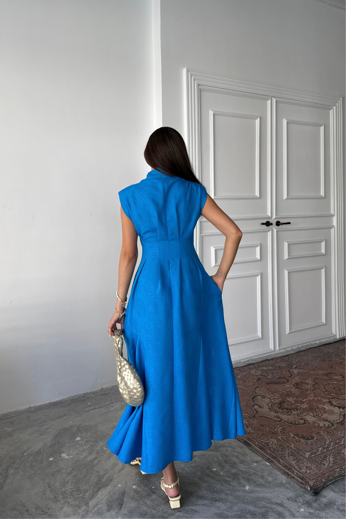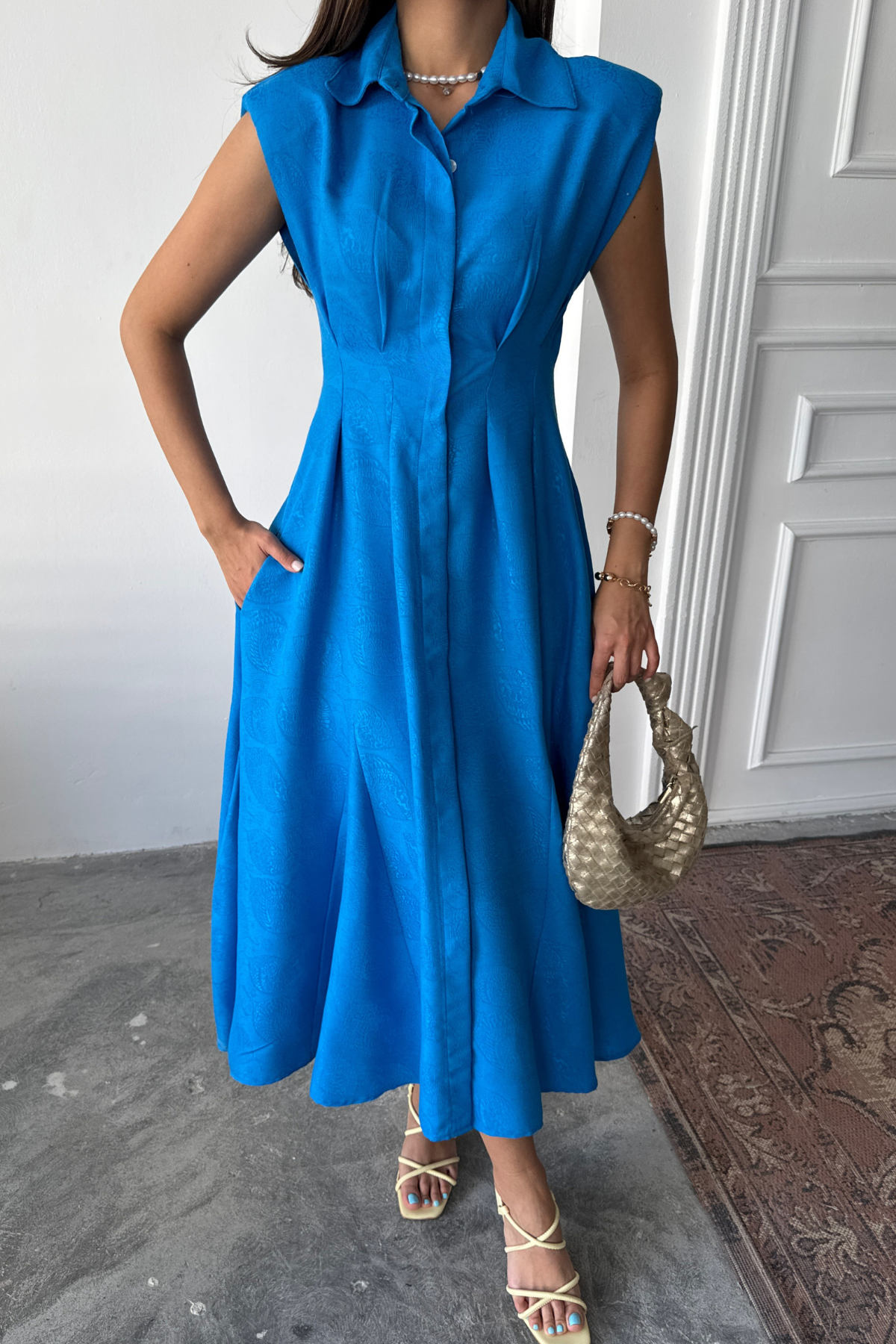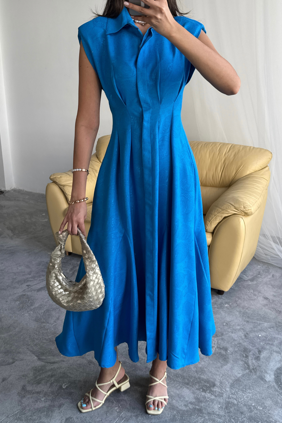 This elegant midi dress is a true statement piece in your wardrobe. Made from a lightweight, flowing fabric, it subtly highlights the figure, while the flared silhouette adds freedom of movement. Structured shoulders create a modern, bold touch, and the classic collar detail adds a refined finish.