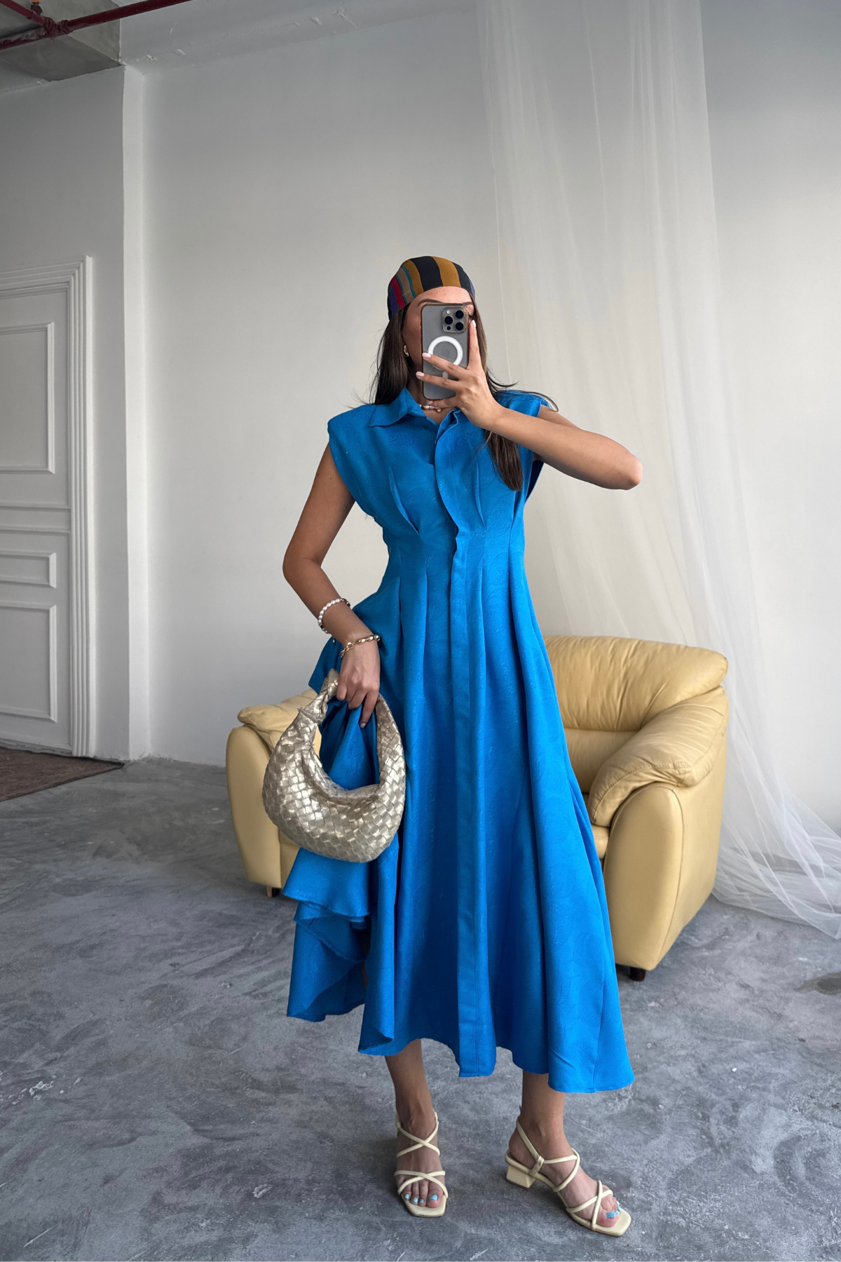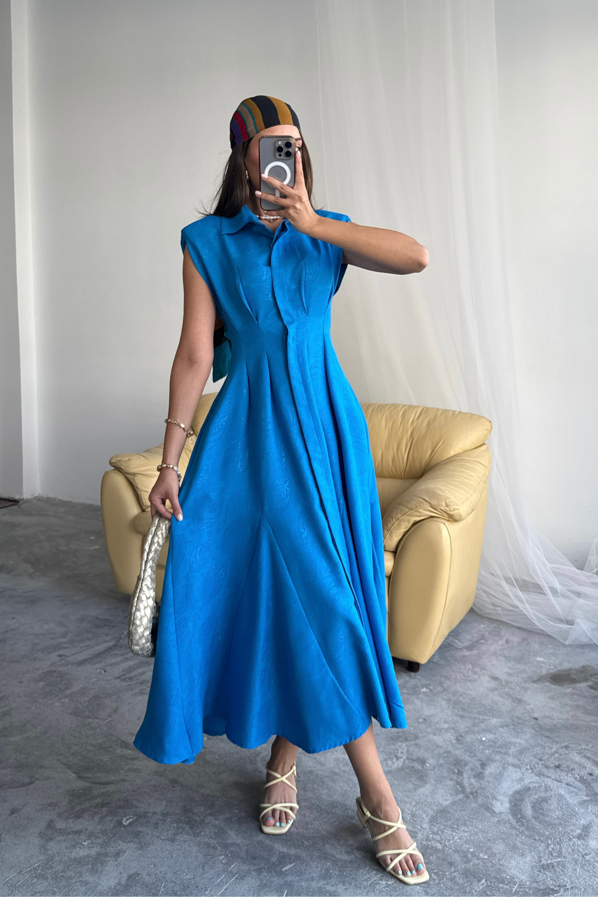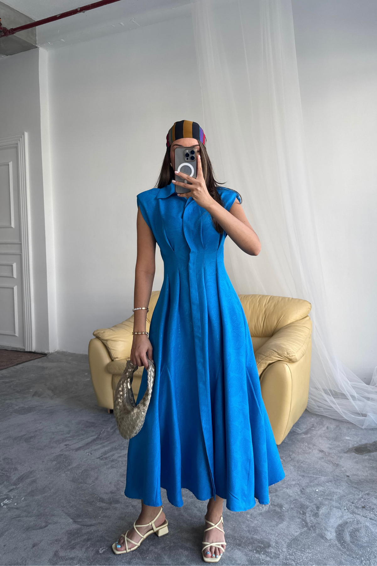 This elegant midi dress is a true statement piece in your wardrobe. Made from a lightweight, flowing fabric, it subtly highlights the figure, while the flared silhouette adds freedom of movement. Structured shoulders create a modern, bold touch, and the classic collar detail adds a refined finish.