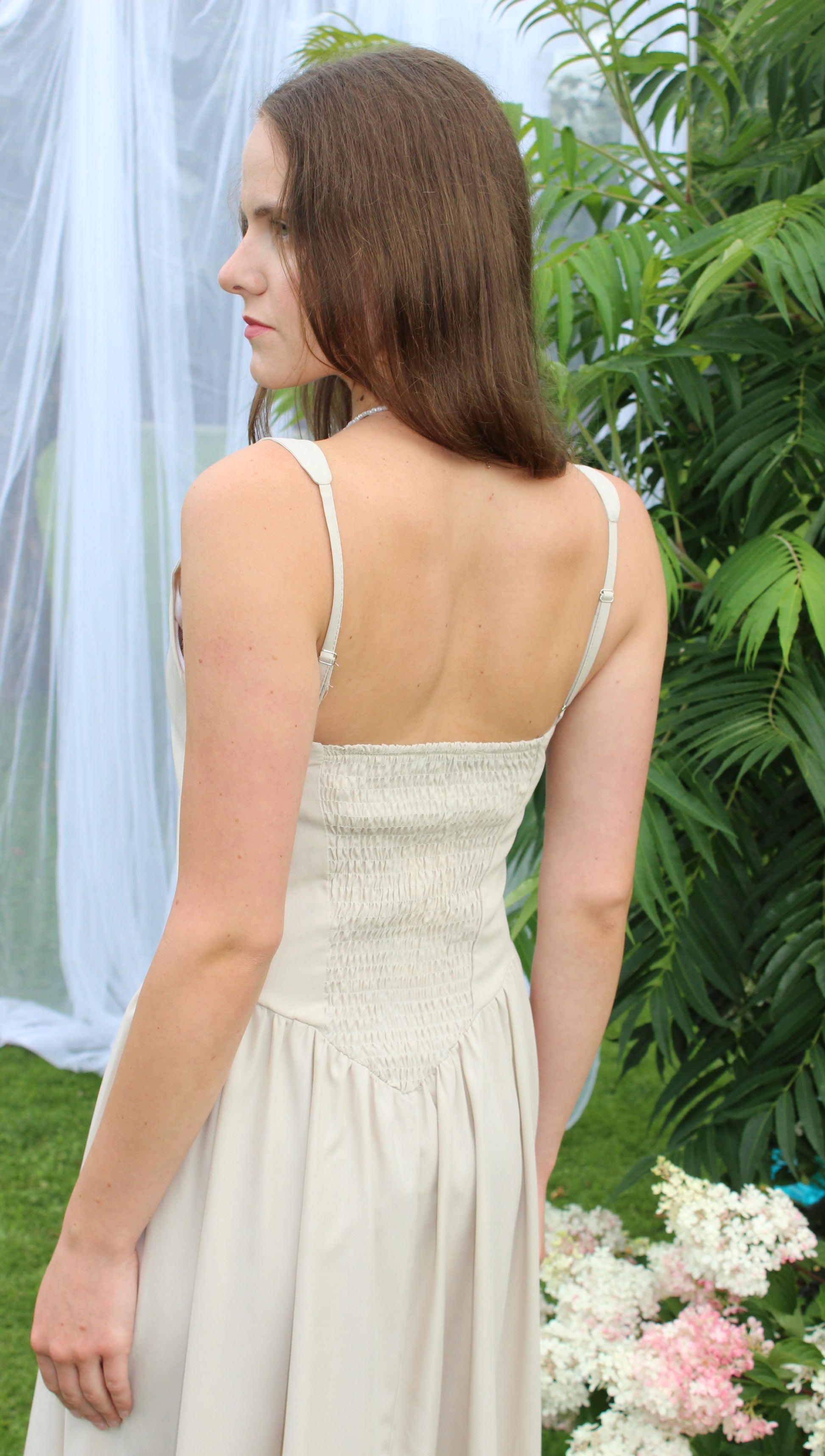 Inspired by femininity and timeless charm, the Sandy Elegance dress is the perfect piece for both everyday moments and special occasions. This soft sand-colored dress features a flattering square neckline and a fitted bodice that flows gracefully into a gathered, voluminous midi skirt.