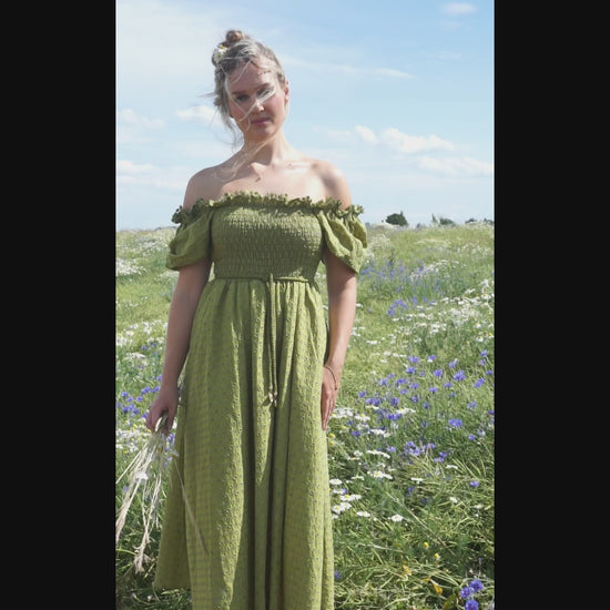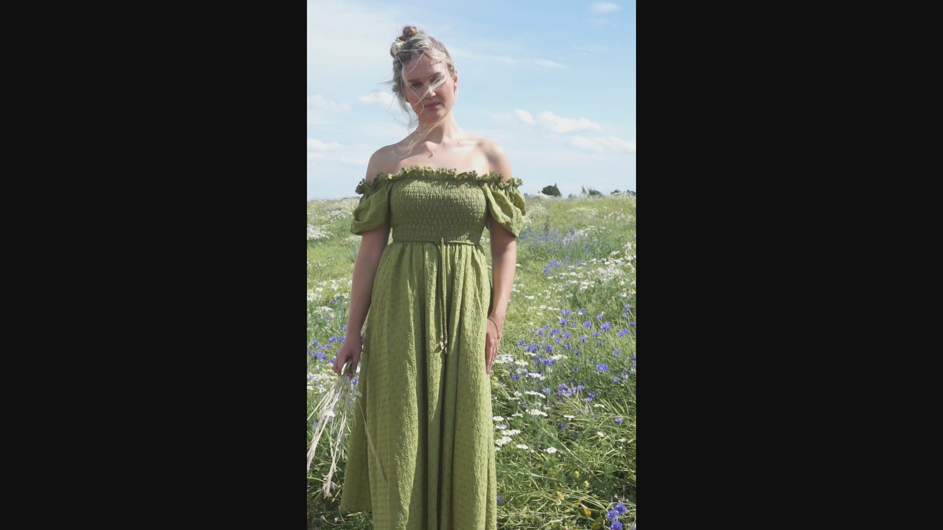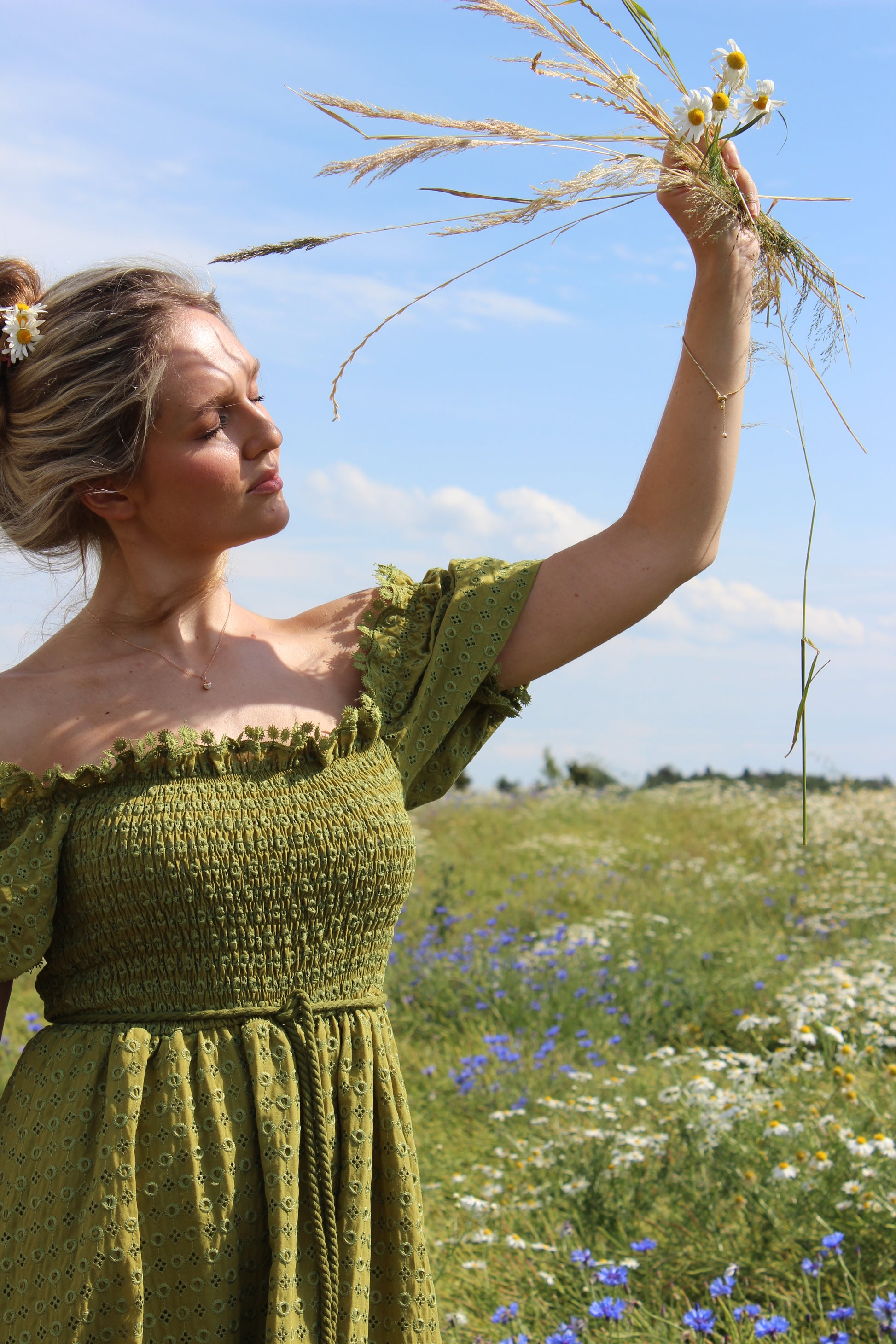 Dress „Smilga“- a nature-inspired dress for the bohemian soul. The olive green hue, flowing silhouette, and off-the-shoulder design create a soft yet expressive look. The elastic top accentuates the figure, while the natural pattern evokes the quiet and peace of the fields. Perfect for summer celebrations, walks, and romantic moments.