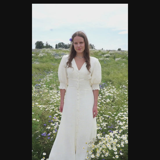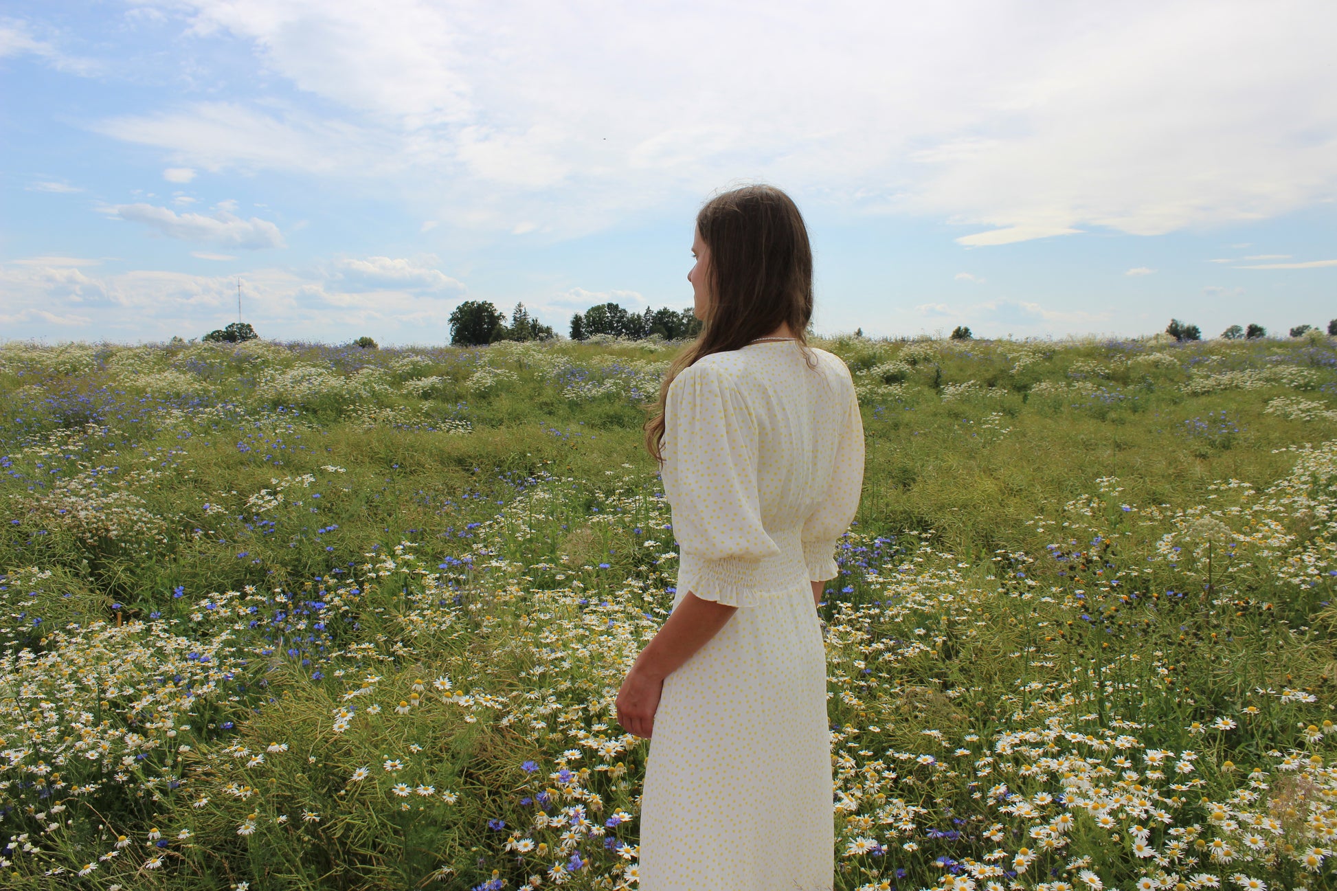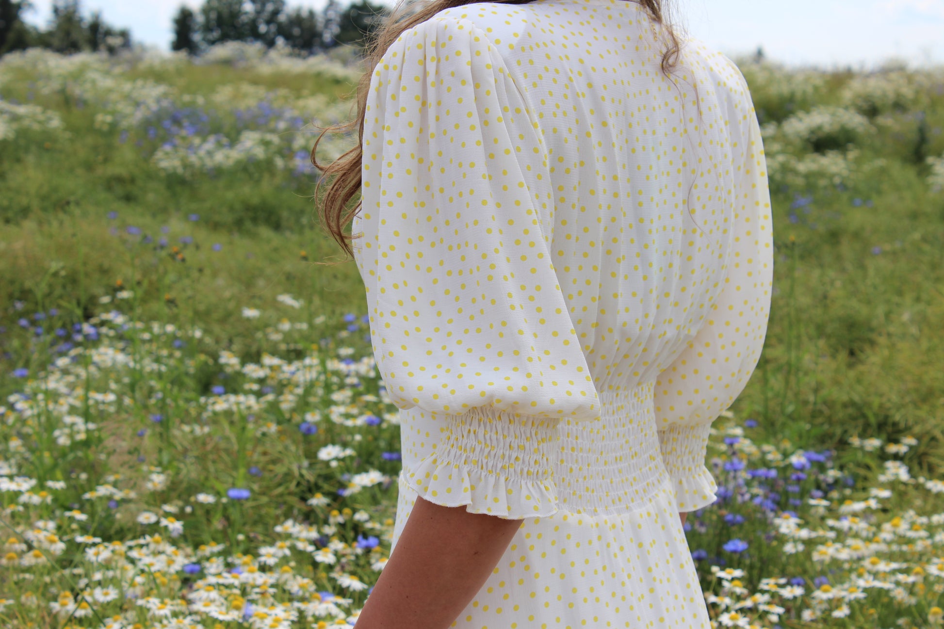 Dress „Smiltė“- this soft yellow midi dress with a light silhouette and delicate pleats is designed for a woman who appreciates subtlety and elegance. The deep V-neck, decorative buttons, and puffed sleeves add a unique touch. A perfect choice for both summer walks and a romantic evening.